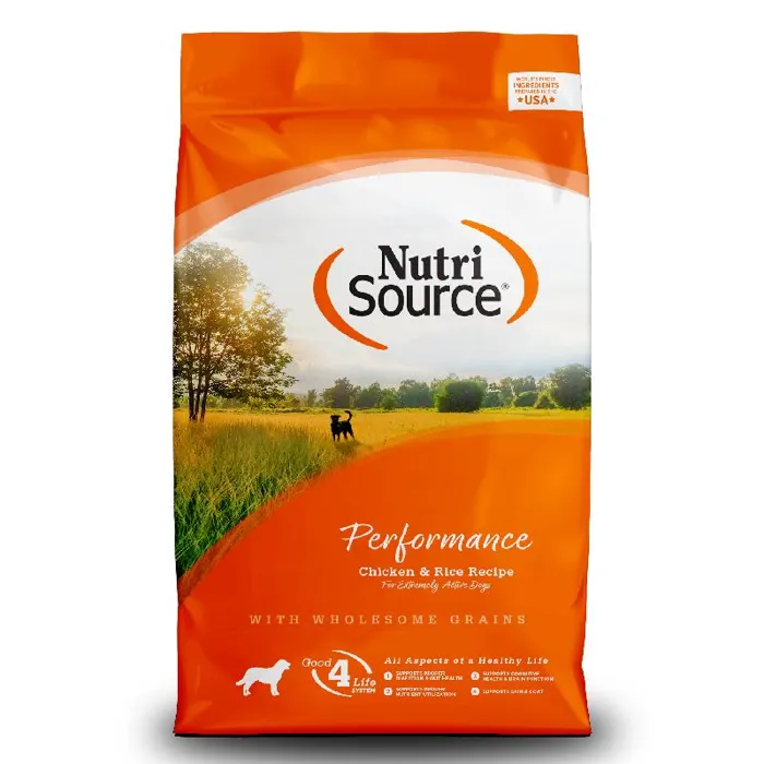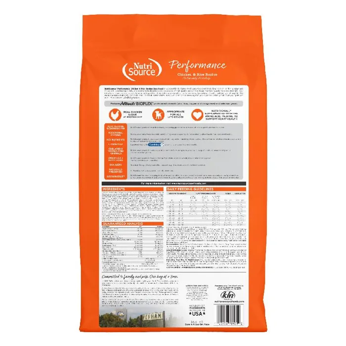 NutriSource® Performance Chicken and Rice formula is ideal for all breeds and all life stages. NutriSource® Performance Chicken and Rice formula delivers premium nutrition in a holistically formulated, easy-to-digest food. Our Performance dog food is often considered the best value in any store across the nation, pound for pound when it comes to cost, quality ingredients and our unsurpassed Alltech supplements (Good 4 Life) - there is no equal! We combine low-ash chicken meal, humanely certified chicken, rice, and carefully selected holistic ingredients to promote balanced growth and unparalleled health for your special friend. Health of your beloved pet is our #1 priority and our unmatched use of Good 4 life supplements guarantees the new addition to your family won't have any runny stool issues and a healthier immune system, we guarantee it. Bio-availability is important to your pets long-term health so we created a highly digestible, nutrient dense morsel with +85% digestibility rating. With NutriSource® you can feed less and get more nutrition - Health begins here!. NutriSource®Performance Chicken & Rice Formula Dog Food is formulated to meet the nutritional levels established by the Association of American Feed Control Officials (AAFCO) Dog Food Nutrient Profiles for all life stages except for growth of large size dogs (70 lbs. or more as an adult). NutriSource® foods can ensure maximum bioavailability - All the nutrition necessary for a happy, healthy life.