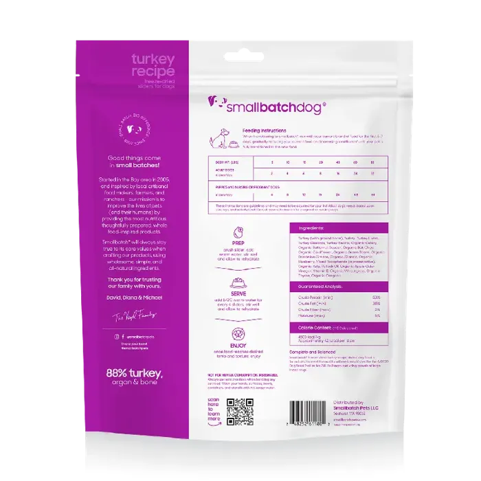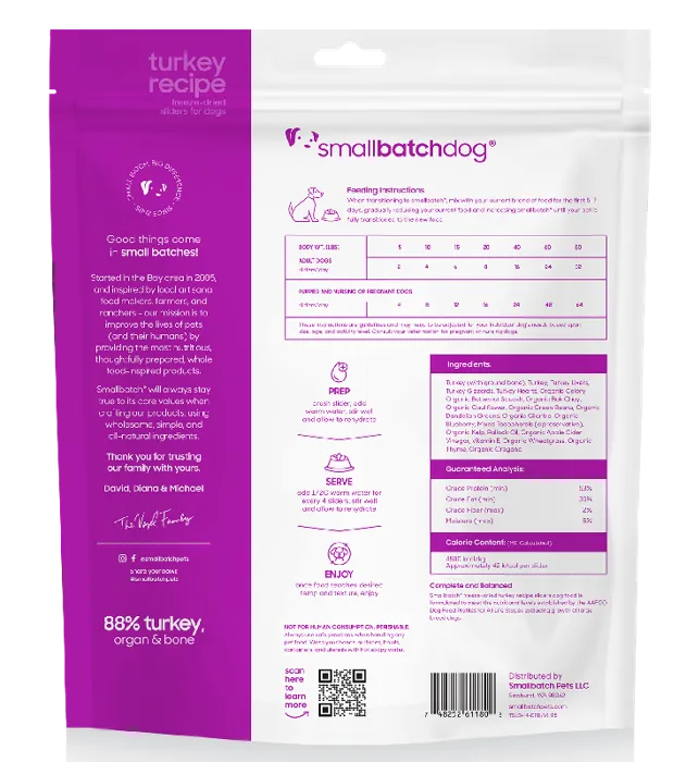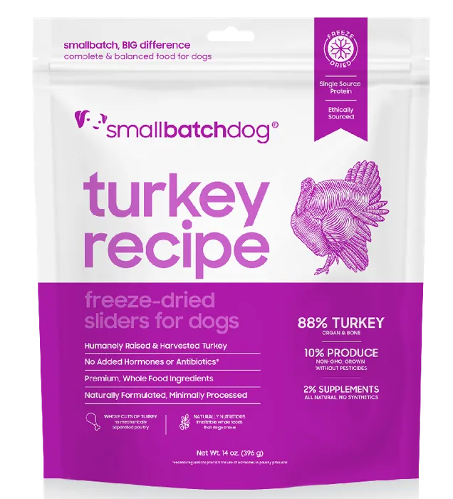 COMPLETE AND BALANCED- freeze-dried turkey recipe sliders dog food IS FORMULATED TO MEET THE NUTRITIONAL LEVELS ESTABLISHED BY THE AAFCO DOG FOOD PROFILES FOR ALL LIFE STAGES excluding growth of large breed dogs.