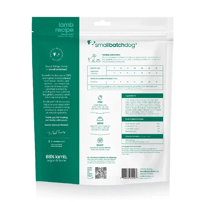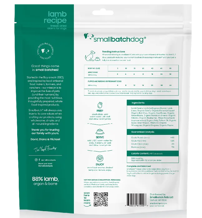 78% humanely raised grass fed lamb, 20% organic produce, 2% natural supplementslamb (including bones), lamb hearts, lamb livers, lamb kidneys, organic winter squash, organic celery, organic green beans, organic bok choy, salmon oil, organic dandelion, o78% humanely raised grass fed lamb, 20% organic produce, 2% natural supplementslamb (including bones), lamb hearts, lamb livers, lamb kidneys, organic winter squash, organic celery, organic green beans, organic bok choy, salmon oil, organic dandelion, organic apple cider vinegar, organic kelp*, organic cilantro, organic bee pollen, organic wheat grass, organic bilberry, organic garlic, organic thyme, organic oregano*OUR ORGANIC KELP IS SOURCED FROM THE PRISTINE WATERS OF ICELAND AND IS THE ONLY INGREDIENT THAT COMES FROM OUTSIDE THE USA. RECONSTITUTED ANALYSIS / AS FED:Moisture (max): 3.0%Crude Protein (min): 47.0%Crude Fat (min): 36.0%Crude Fiber (max): 2.0%Calcium (min): 1.5%Phosphorus (min): 1.2%ME = 59 kcal/slider FEEDING GUIDELINESTo rehydrate, simply mix ½ cup of warm water for every 4 sliders.  Crush sliders and allow mixture to rehydrate for a few minutes then serve.5 lbs: 2 Sliders per day10 lbs: 4 Sliders per day15 lbs: 6 Sliders  per day20 lbs: 8 Sliders  per day40 lbs: 16 Sliders per day60 lbs: 24 Sliders per day80 lbs: 32 Sliders per day100 lbs: 40 Sliders per dayFor nursing or pregnant dogs and puppies, quantities per day can be doubled.  Please note that you should always consult your veterinarian especially when it comes to mommas-to-be or nursing dogs. These are only guidelines and may need to be adjusted depending on your individual dog’s needs.