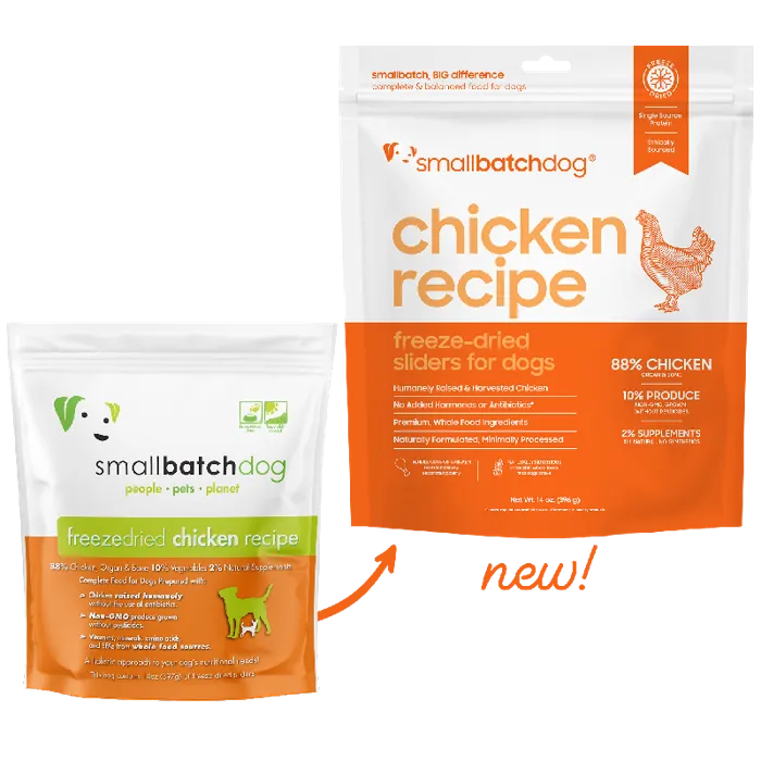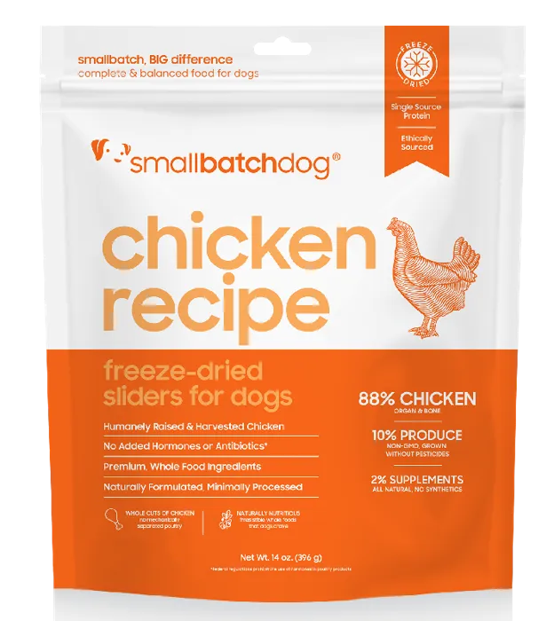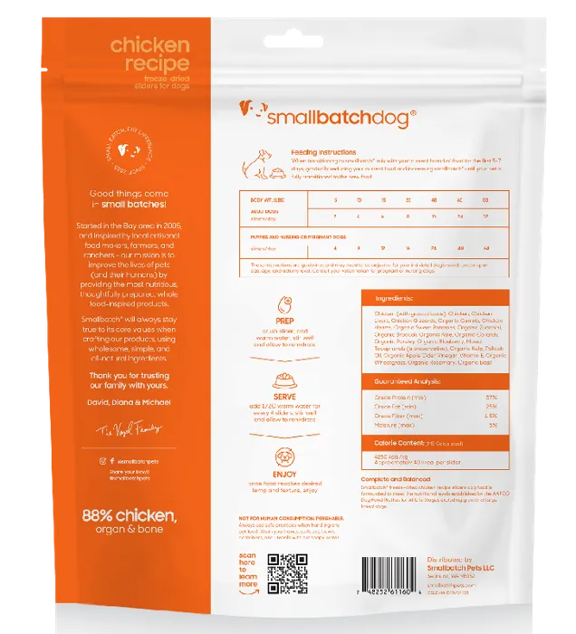 88% humanely raised and harvested chicken, 10% organic produce, 2% natural supplementsskinless chicken necks, chicken backs, chicken, chicken livers, chicken hearts, chicken gizzards, organic carrots, organic yams, organic broccoli, organic squash, salm88% humanely raised and harvested chicken, 10% organic produce, 2% natural supplementsskinless chicken necks, chicken backs, chicken, chicken livers, chicken hearts, chicken gizzards, organic carrots, organic yams, organic broccoli, organic squash, salmon oil, organic kale, organic collards, organic apple cider vinegar, organic kelp*, organic parsley, organic bee pollen, organic wheat grass, organic bilberry, organic garlic, organic rosemary, organic basilMoisture (max): 6%Crude Protein (min): 58.7%Crude Fat (min): 26.8%Crude Fiber (max): 1.6%Calcium (min): 2.6%Phosphorus (min): 1.8%ME = 56 kcal/sliderTo rehydrate, simply mix ½ cup of warm water for every 4 sliders.  Crush sliders and allow mixture to rehydrate for a few minutes then serve.5 lbs: 2 Sliders per day10 lbs: 4 Sliders per day15 lbs: 6 Sliders  per day20 lbs: 8 Sliders  per day40 lbs: 16 Sliders per day60 lbs: 24 Sliders per day80 lbs: 32 Sliders per day100 lbs: 40 Sliders per dayFor nursing or pregnant dogs and puppies, quantities per day can be doubled.  Please note that you should always consult your veterinarian especially when it comes to mommas-to-be or nursing dogs. These are only guidelines and may need to be adjusted depending on your individual dog’s needs.
